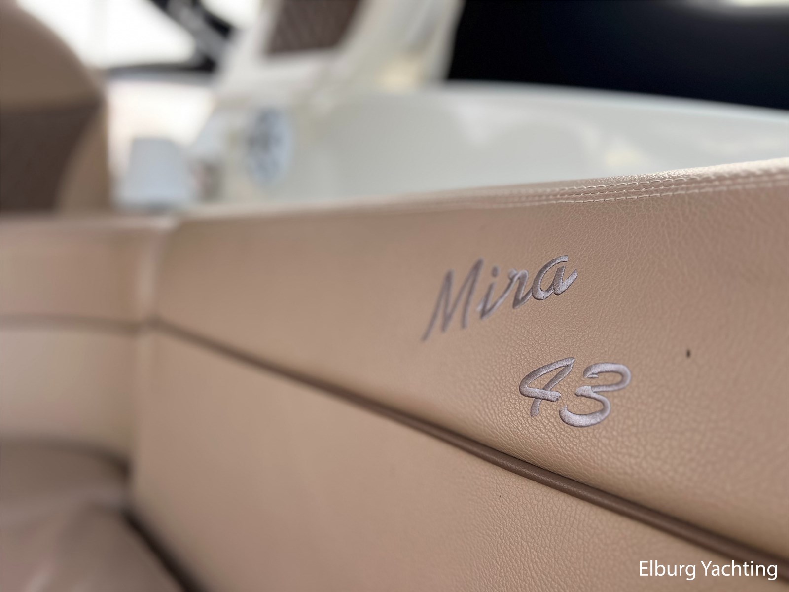 - Gelakt teak interieur met creme kleurige lederen bekleding, licht tapijt over teakvloer (niet verlijmd)